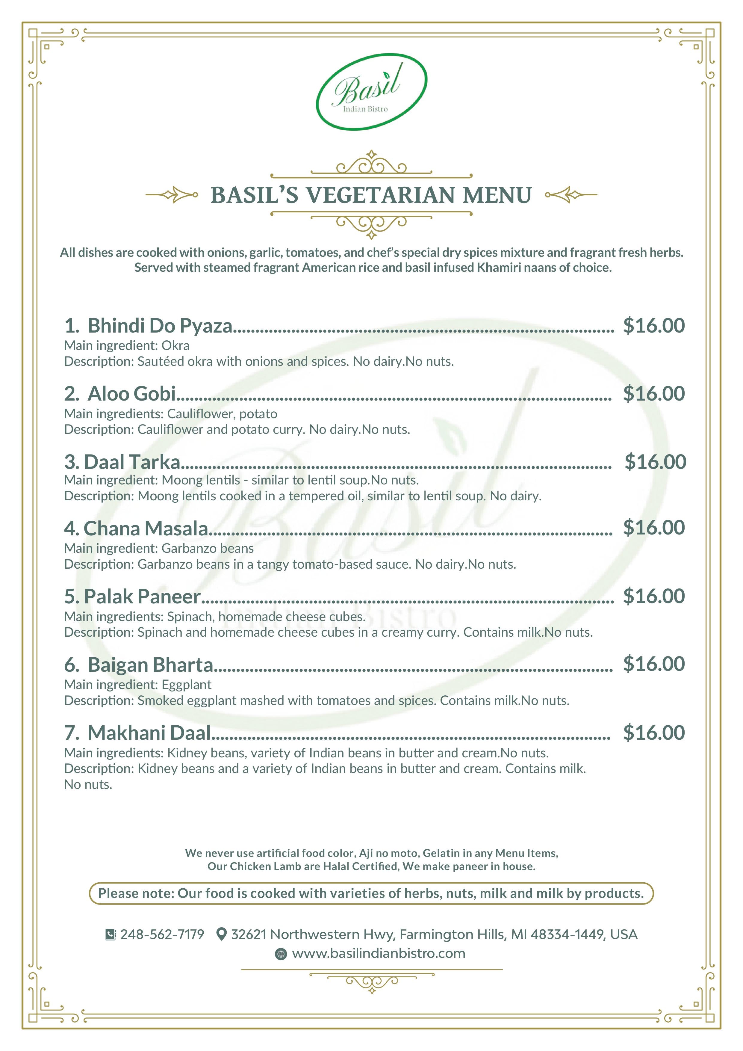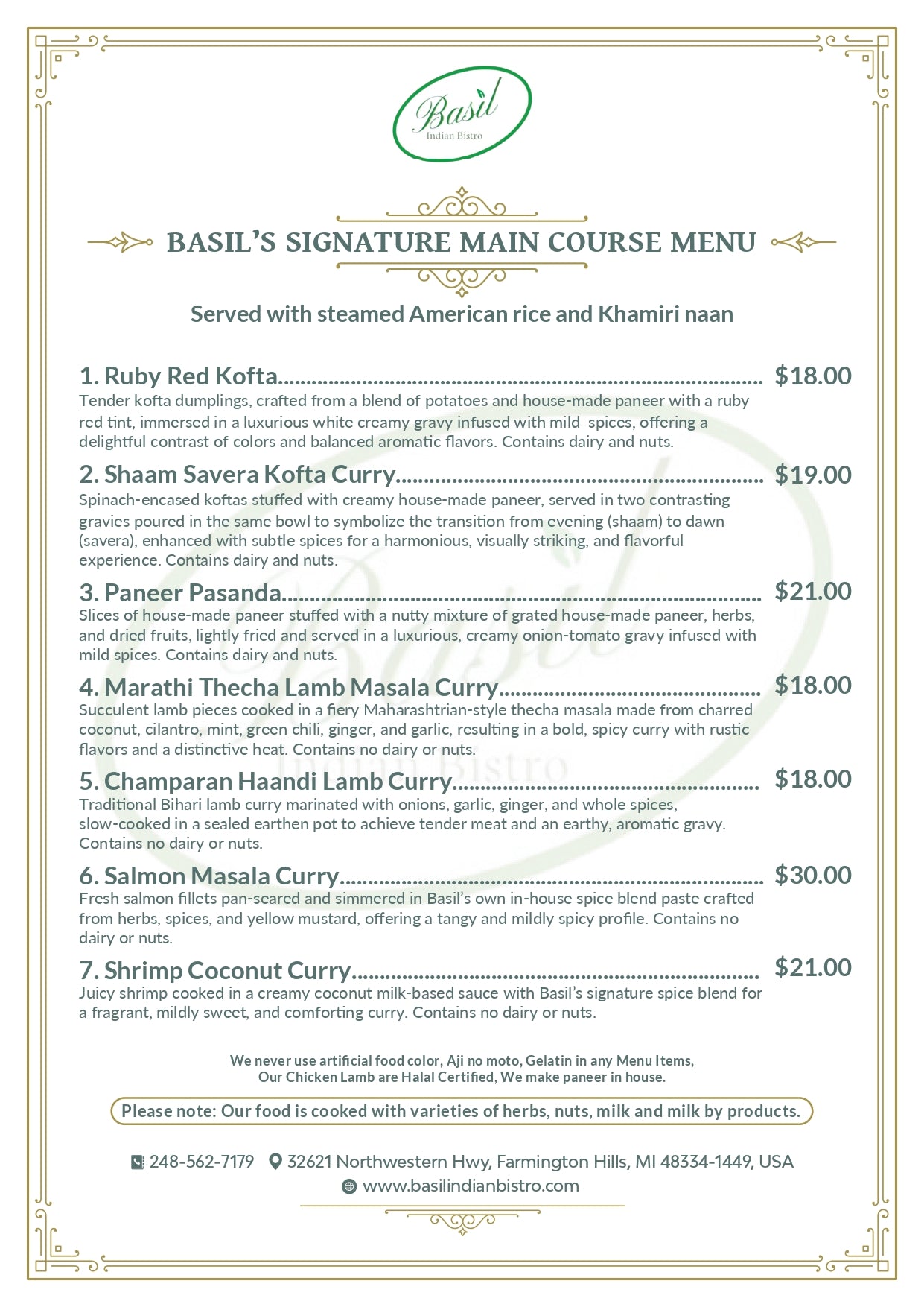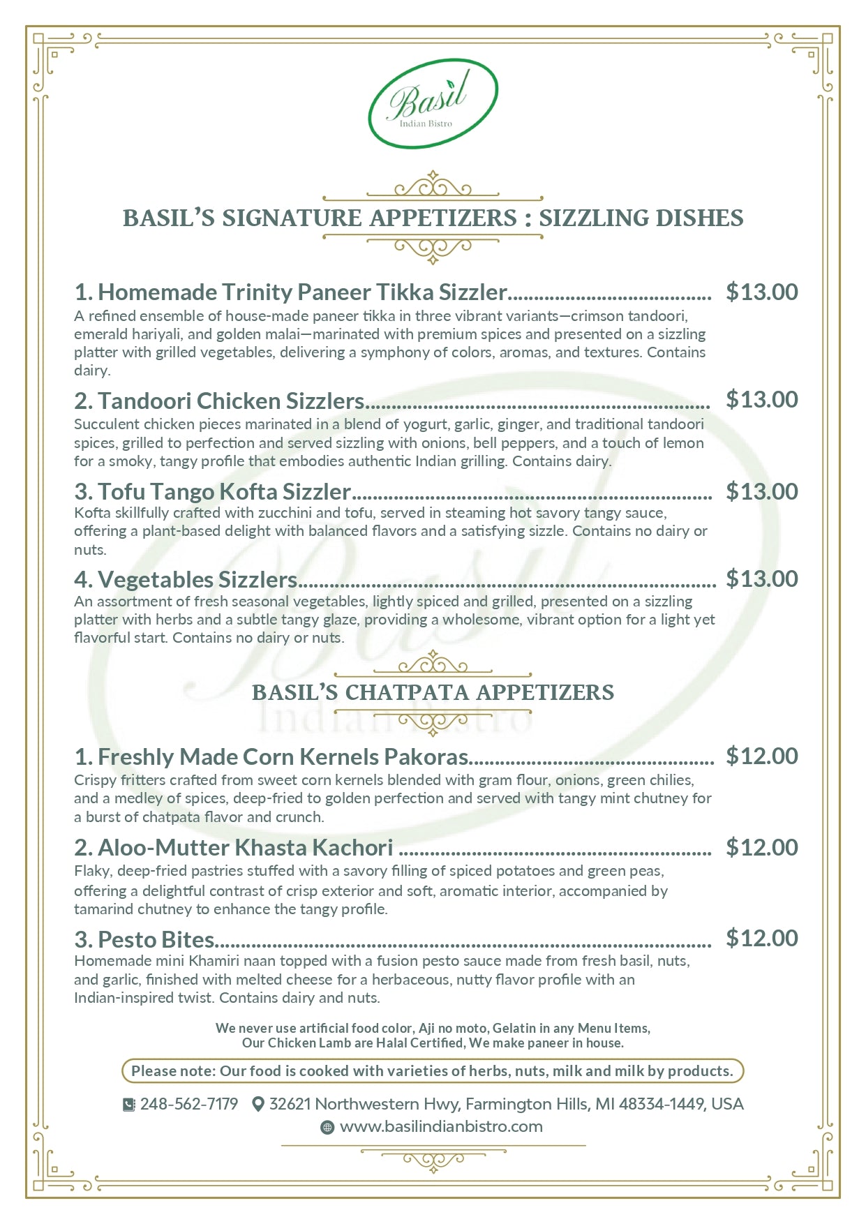Our food is cooked with varieties of herbs, nuts, tree nuts, milk, and milk by products. For any allergy or dietary concerns please call the restaurant before making reservations.